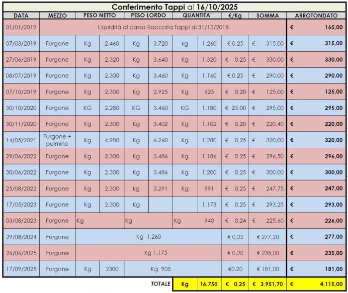 I Tappi vengono conferiti periodicamente presso RG POLIETILENE –Salassa Canavese (To) e vengono riconosciuti circa €/kg 0,25.